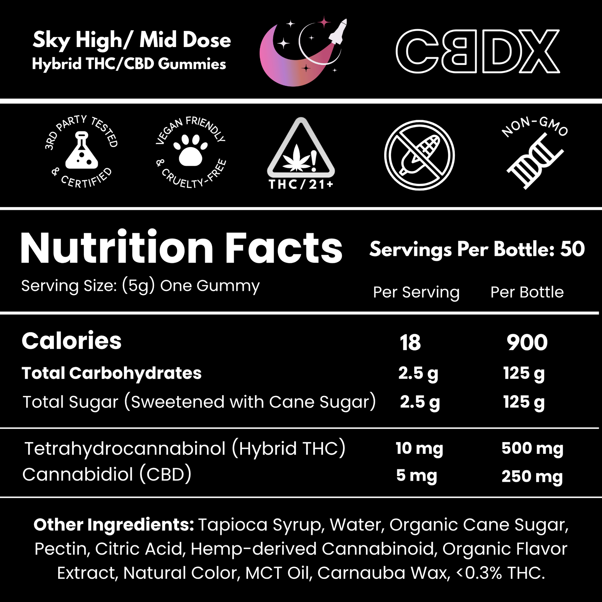 When you want balance in both body and mind, Sky High Hybrid Gummies hit the sweet spot. Delta-9 Hybrid THC and CBD work together to blend the mellow ease of Indica with the clear, uplifting energy of Sativa. The result is a perfectly smooth buzz that relaxes without slowing you down.
